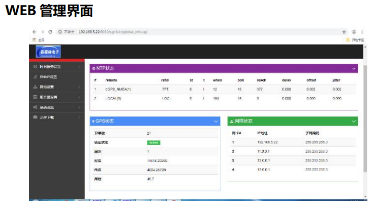 ●方便快捷、開箱即用,用于對設(shè)備進行全局監(jiān)控; ●含設(shè)備運行狀態(tài):NTP狀態(tài)、北斗/GPS狀態(tài)、網(wǎng)絡(luò)狀態(tài)等; ●可進行SNMP設(shè)置(Trap地址等)、網(wǎng)絡(luò)設(shè)置、NTP設(shè)置; ●可開關(guān)服務(wù)器當前運行的服務(wù); ●可下載相關(guān)配置文件和MIB描述文件。
